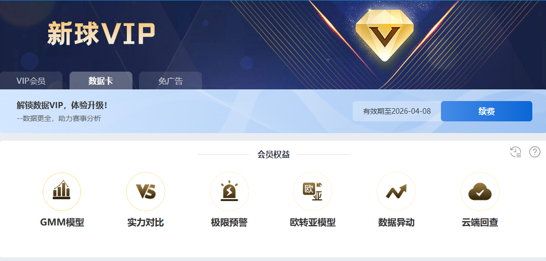 数据卡权益:GMM模型+实力对比+极限预警+欧转亚模型+数据异动+云端回查+竞足支持率+MAC前瞻