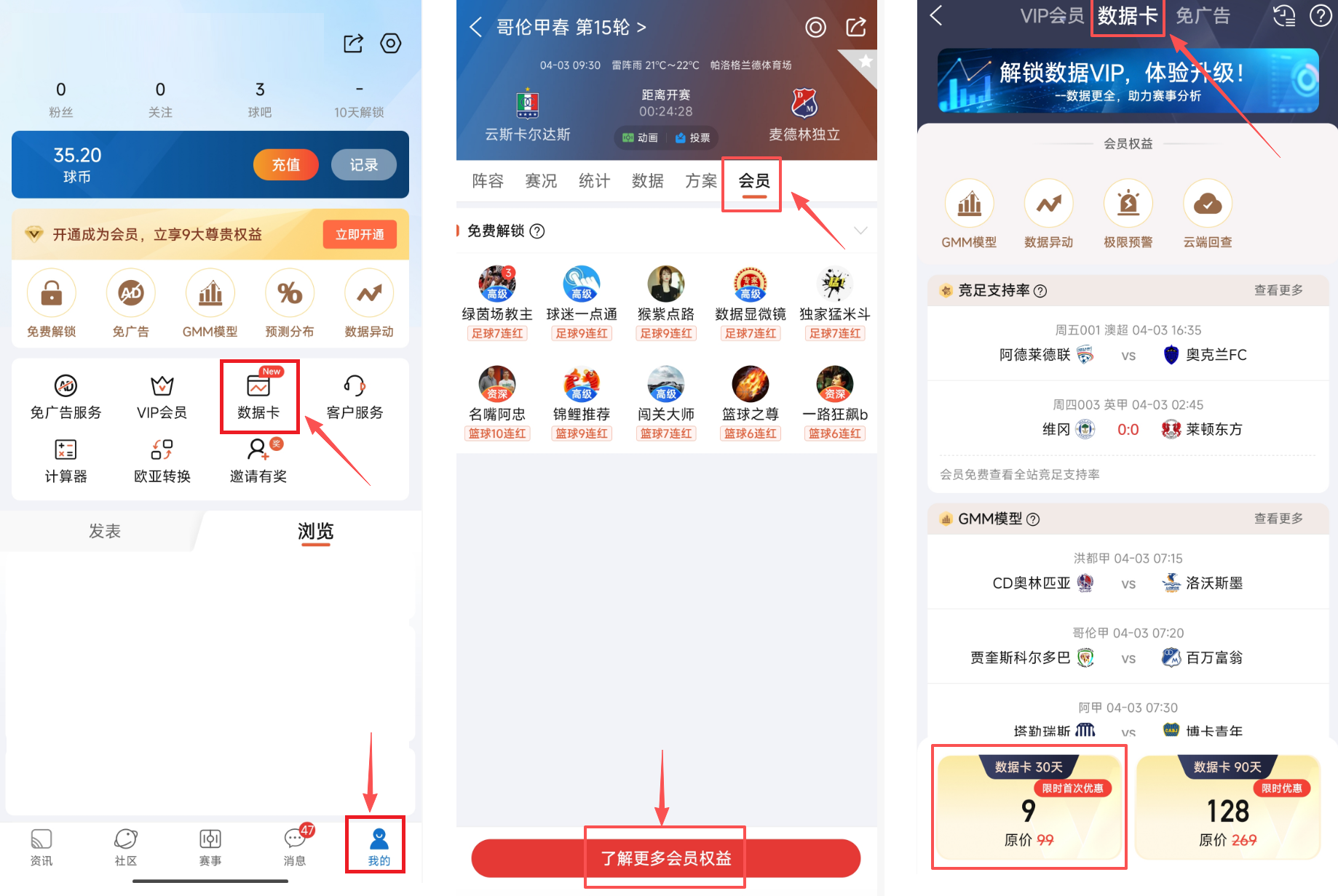 APP订阅位置:底部“我的”→ 数据卡或在任意赛事详细页中 → 点击“会员” → 底部了解更多权益 → 选择【数据卡】