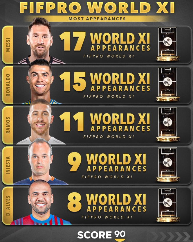 FIFPRO同步更新了历史入选次数排名前十的球员,彰显了他们在职业生涯巅峰期的长久统治力: